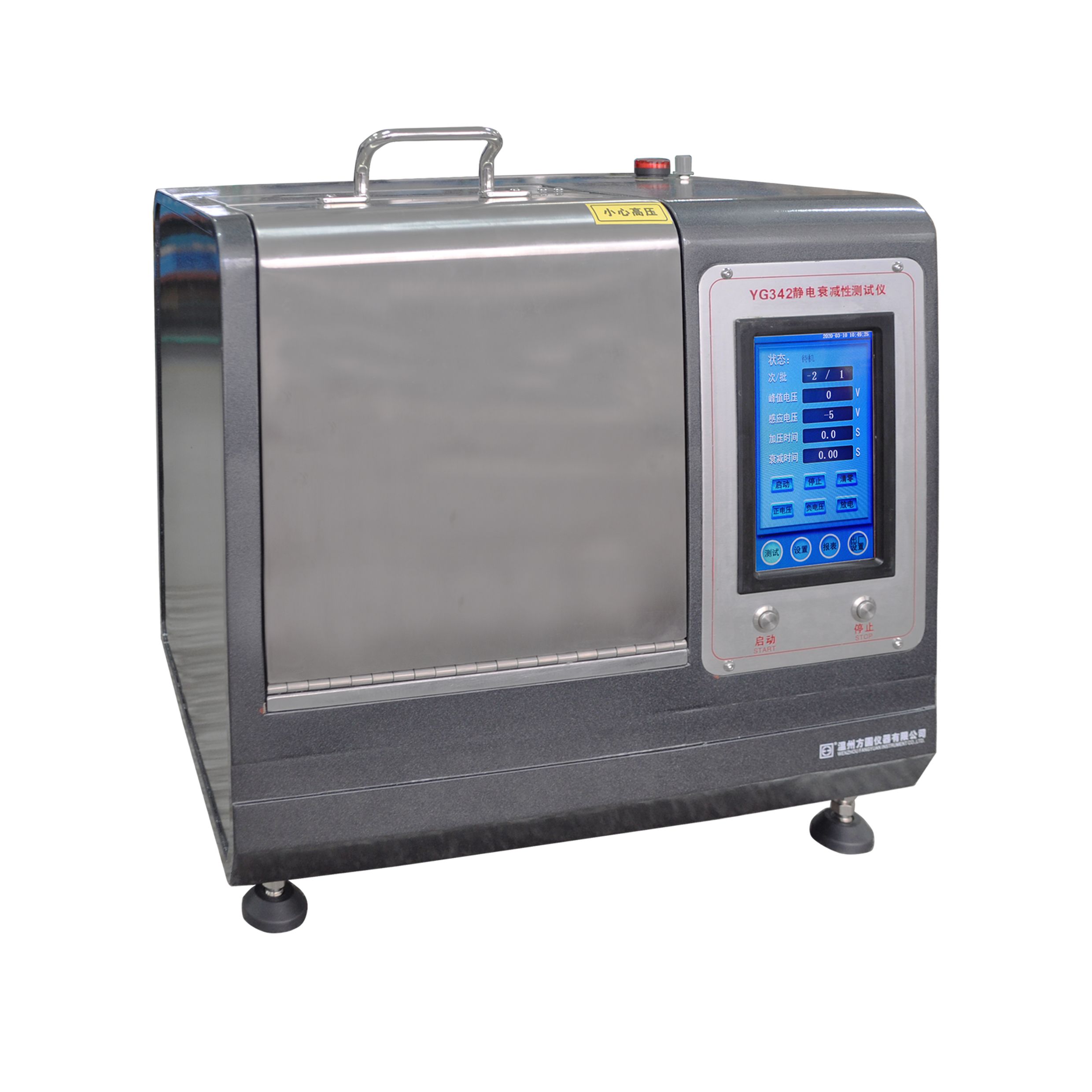 用途:用于測試醫(yī)用防護服材料和無紡布在施加±5000V電壓作用后停止充電,在接地的時候材料能夠消除誘導到材料表面的電荷的能力,即測定由峰值電壓衰減到10%的靜電衰減時間。